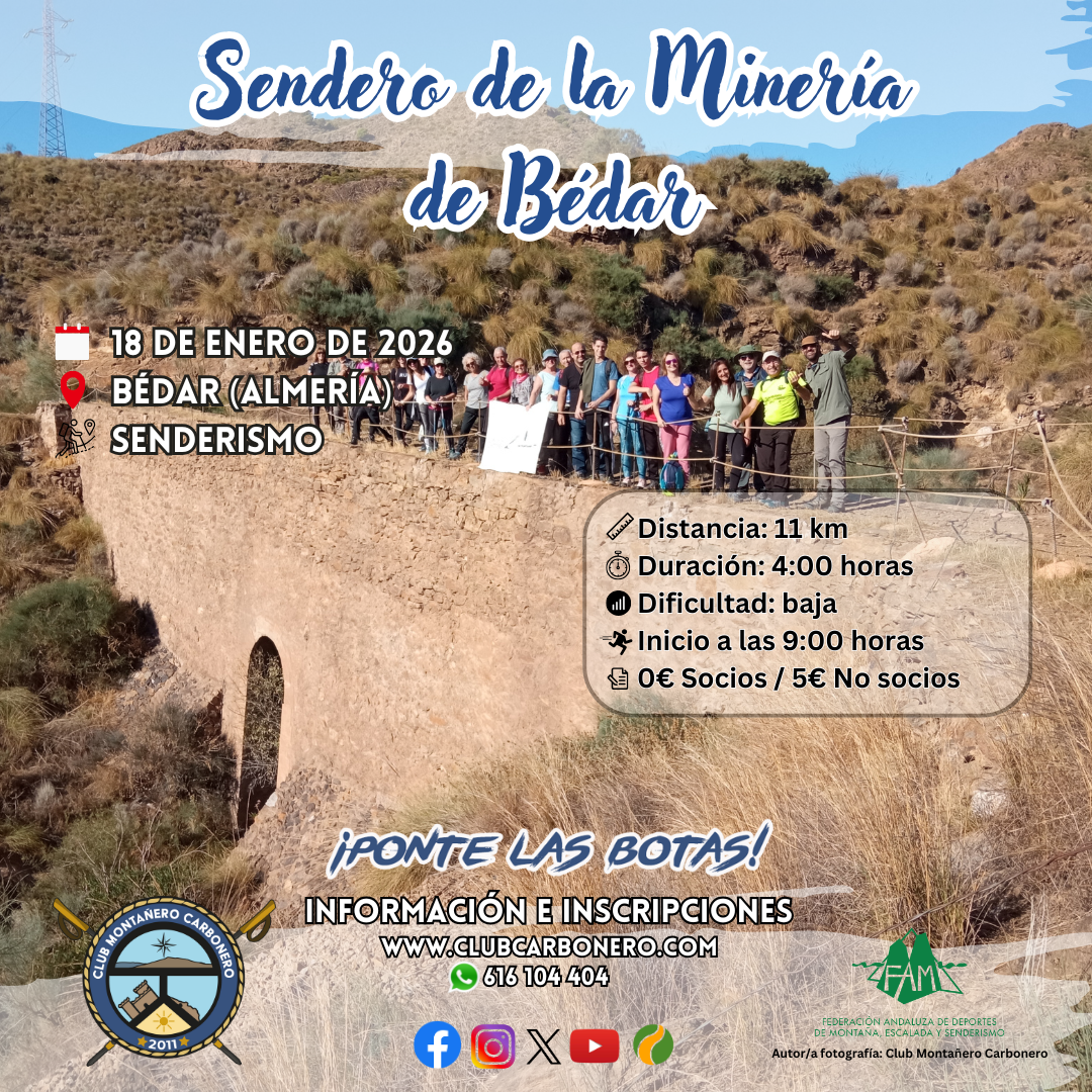 El Club Montañero Carbonero organiza el domingo 18 de enero de 2026 el sendero de la Minería de Bédar.