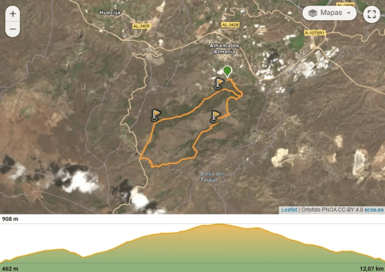 Ruta de senderismo que parte de las afueras de Alhama de Almería, siguiendo el trazado de un sendero homologado por la Federación Andaluza de Montañismo. Recorre el Barranco de los Cazadores, entre otros parajes, donde podemos observar una extensa arboleda de pinos que fue afectada por un incendio forestal hace unos años.
