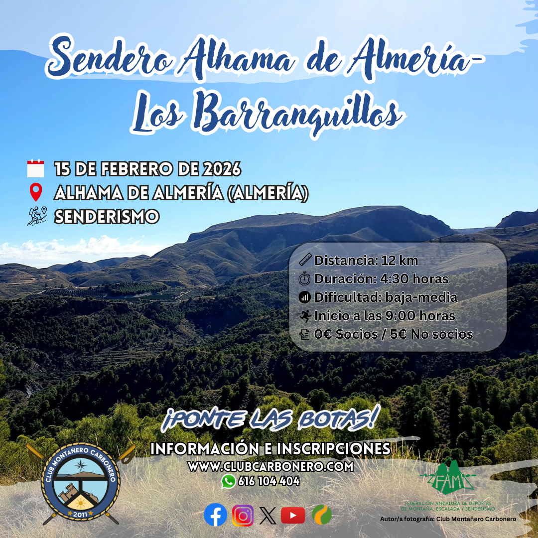 El Club Montañero Carbonero organiza el domingo 15 de febrero de 2026 la ruta de senderismo Alhama de Almería-Los Barranquillos.