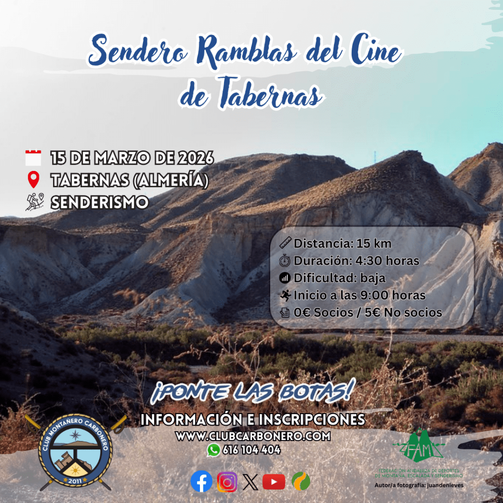 El Club Montañero Carbonero organiza el domingo 15 de marzo de 2026 la ruta de senderismo Sendero Ramblas del Cine de Tabernas.