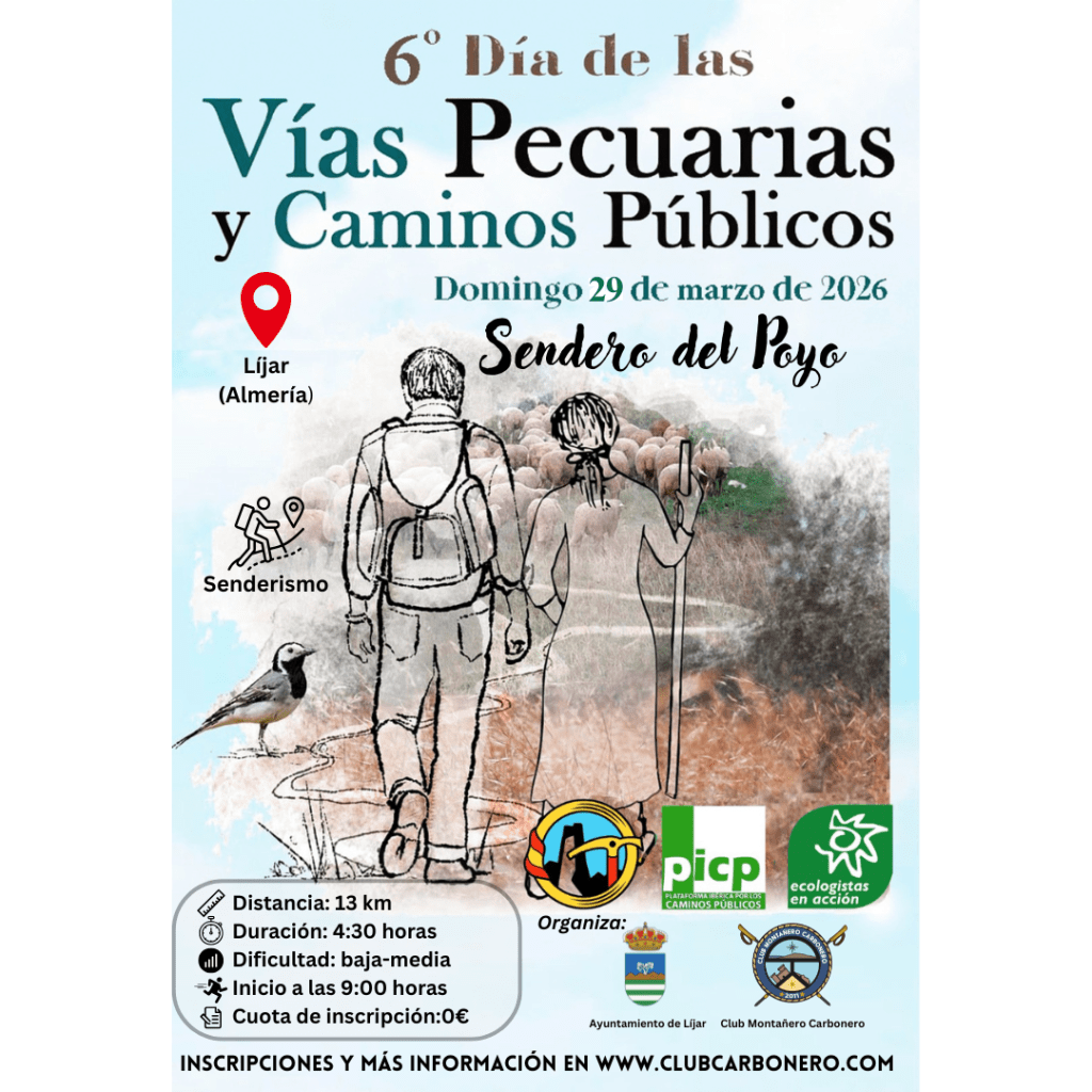 El Club Montañero Carbonero y el Ayuntamiento de Líjar organizan el domingo 29 de marzo de 2026 el Sendero del Poyo con motivo del 6º Día de las Vías Pecuarias y Caminos Públicos.