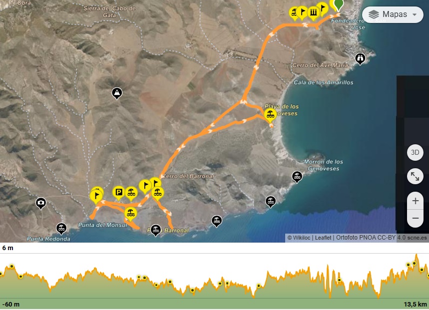 Esta ruta nos permitirá recorrer una de las zonas más conocidas del Parque Natural de Cabo de Gata – Níjar. Desde de San José visitaremos las dos playas más visitadas del Cabo de Gata: Los Genoveses y Mónsul, aunque también conoceremos las menos accesibles como la Cala del Barronal y llegaremos hasta la Cala de la Media Luna.
