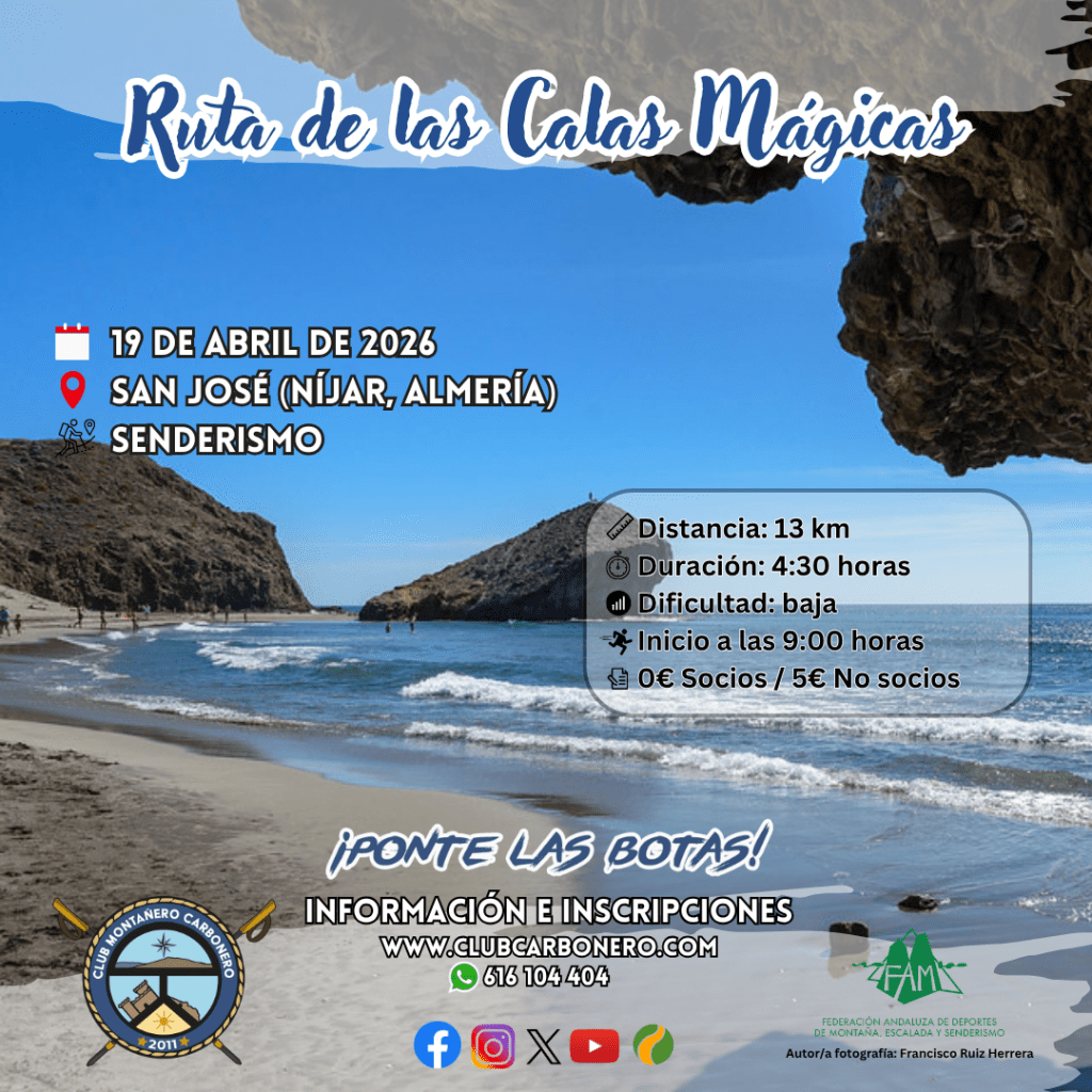 El Club Montañero Carbonero organiza el domingo 19 de abril de 2026 la ruta de senderismo Ruta de las Calas Mágicas.