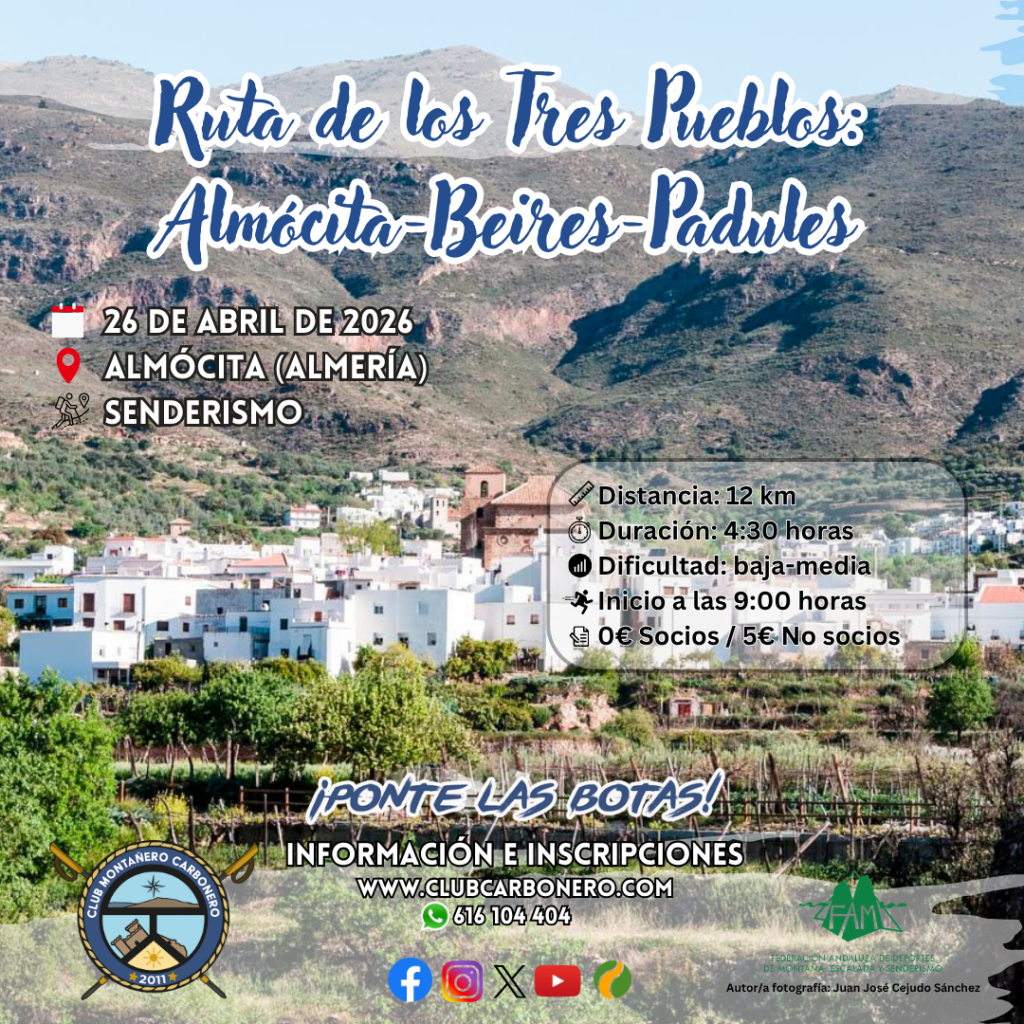 El Club Montañero Carbonero organiza el domingo 26 de abril de 2026 la ruta de senderismo Ruta de los Tres Pueblos: Almócita-Padules-Beires.
